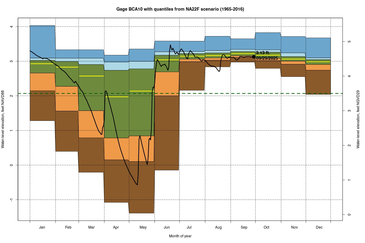 | Daily Water Level Percentiles by Month for BCA10 (percentiles based on NA22F model 1965–2016) |
