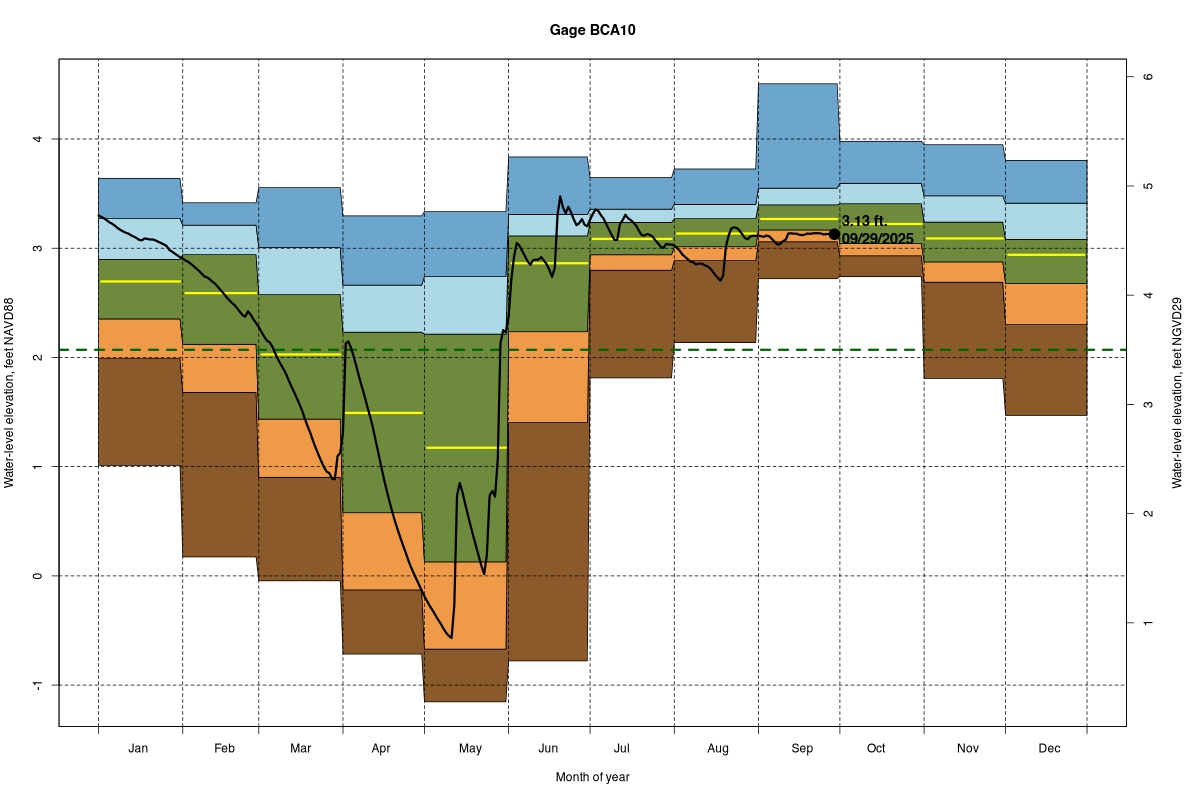 | Daily Water Level Percentiles by Month for BCA10 (percentiles based on 1/1/2000–2024) |