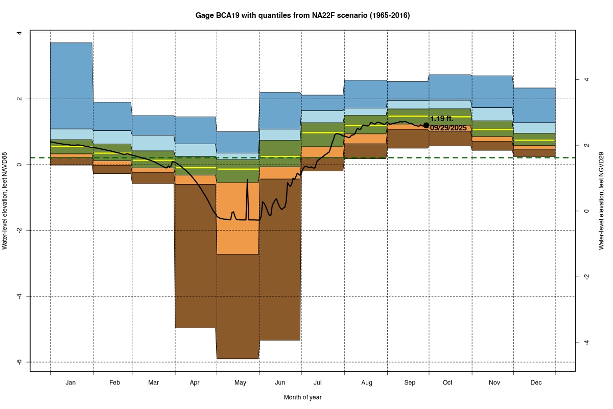 | Daily Water Level Percentiles by Month for BCA19 (percentiles based on NA22F model 1965–2016) |