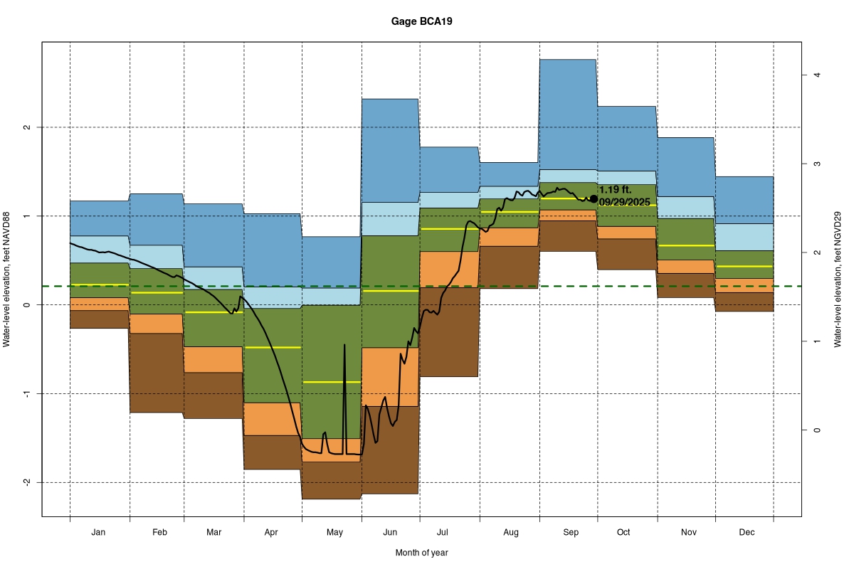 | Daily Water Level Percentiles by Month for BCA19 (percentiles based on 1/1/2000–2024) |
