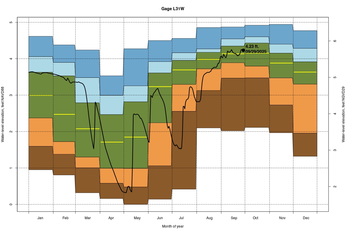 | Daily Water Level Percentiles by Month for L31W (percentiles based on 1/1/2000–2024) |