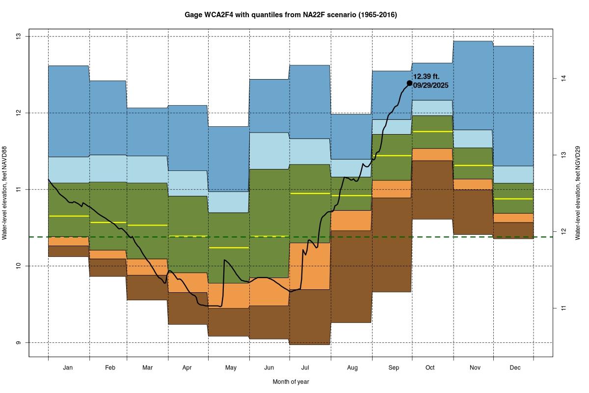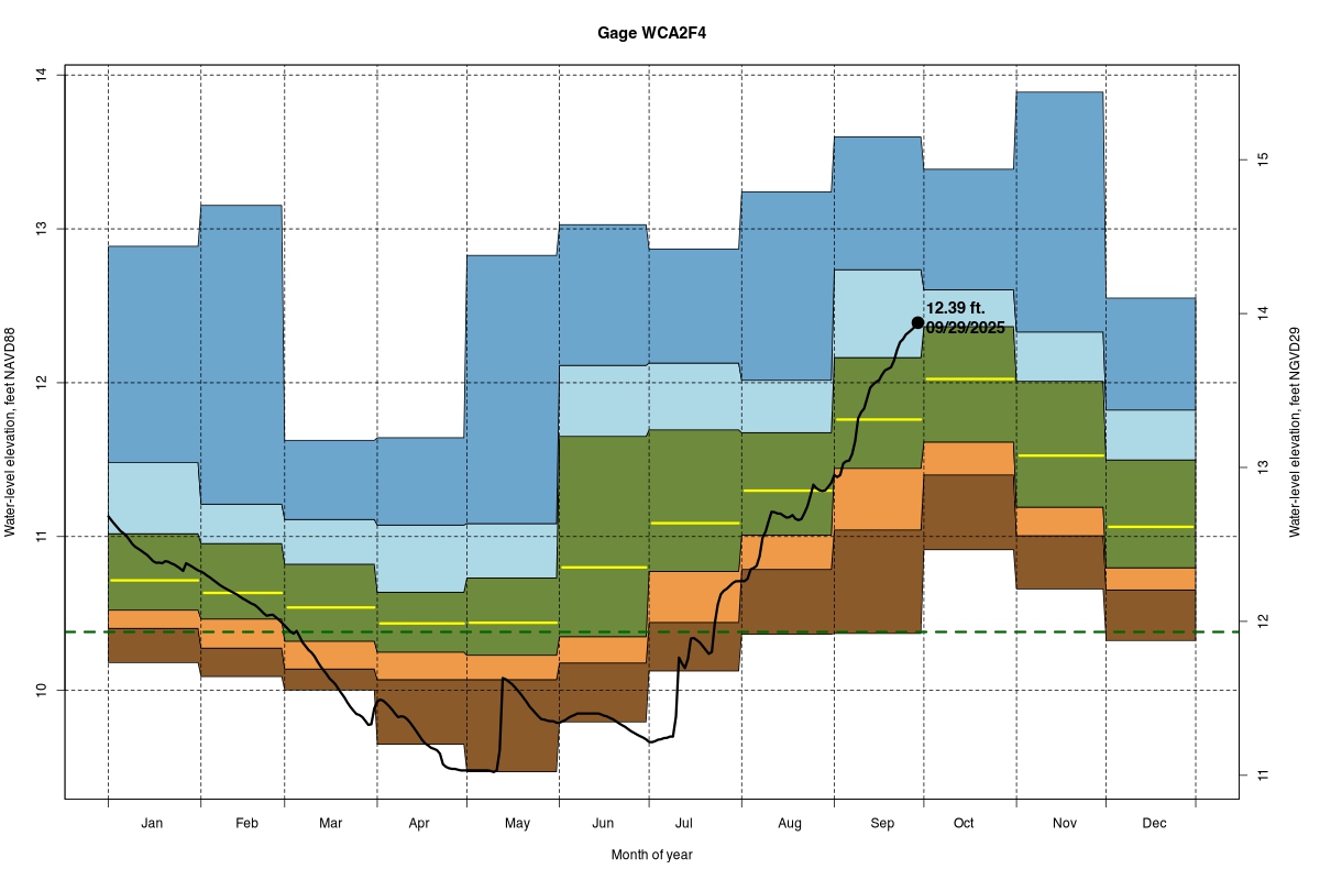 | Daily Water Level Percentiles by Month for WCA2F4 (percentiles based on 1/1/2000–2024)  |